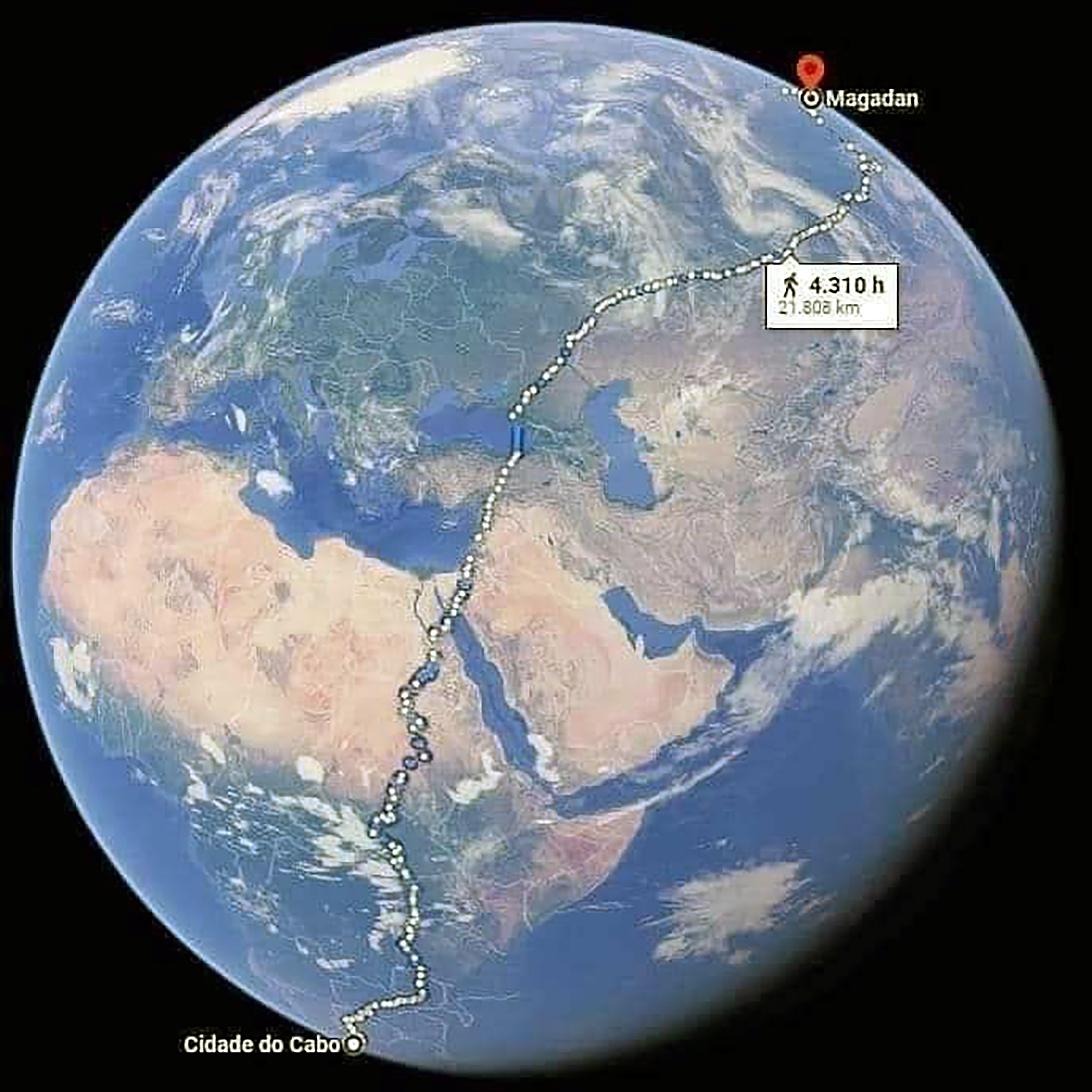 This is the longest way in the world on foot without the need to cross the ocean or any other significant barrier, it runs from Cape Town (South Africa) to Magadan (Russia).